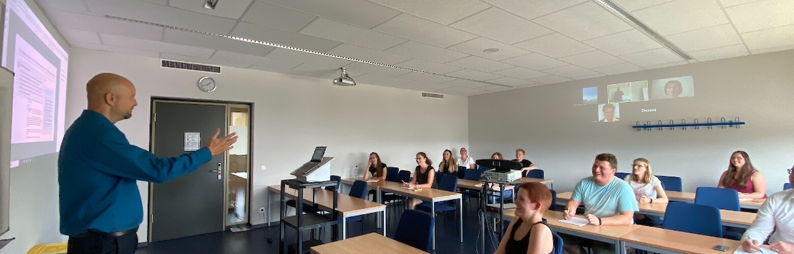 Die hybride Lehre bietet ein optimales Lehr- und Lernerlebnis für alle Teilnehmer*innen. Der Professor*in sieht vor sich die Studierenden auf den Bänken sitzen und auf der Rückwand die online zugeschaltete Studierende. Die Studierenden vor Ort können dem Skript per Beamerprojektion an der Vorderwand folgen und die Studierenden, die online teilnehmen sehen das Skript auf ihrem Bildschirm. Dies ermöglicht eine verbesserte Interaktion. Durch hochauflösende Kameras kann auch das Tafelbild den Onlineteilnehmern lesbar transportiert werden, alternativ stehen Laptops mit Stifteingabe als digitales Whiteboard zur Verfügung.