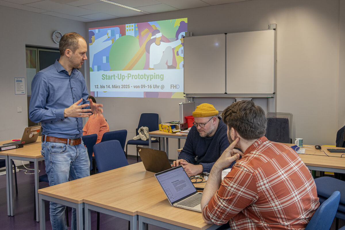 Vom 12. bis 14. März 2025 fand an der Fachhochschule Dresden (FHD) der Workshop „Start-up Prototyping“ unter der Leitung von Prof. Dr. Marius Brade und Nicos Lentzsch statt. Ziel der Veranstaltung war es, Studierenden und Gründungsinteressierten praxisnahe Methoden an die Hand zu geben, um ihre Ideen greifbar zu machen und erste Prototypen zu entwickeln.
