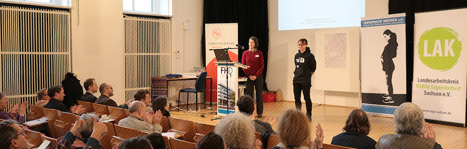 Einerseits identifizieren sich junge Menschen mit ihrem Stadtteil und fühlen sich dort wohl. Andererseits mangelt es an jugendspezifischen Freizeitangeboten. Der Sozialraum der Jugendlichen entspricht nicht den geografisch-strukturellen Grenzen des sogenannten Stadtraums, vielmehr werden interessante Treffpunkte in ganz Dresden aufgesucht. An (halb)öffentlichen Orten im Stadtteil werden Jugendliche häufig negativ wahrgenommen und verdrängt. In vielen Städten werden Alkohol- und Bettelverbote über Polizeiverordnungen ausgesprochen und Bußgelder verhängt. Dies muss zu der Frage führen, wem der öffentliche Raum (nicht) gehört. Der Fachtag behandelte diese Frage anhand konkreter Projekte und einer intensiven Diskussion mit über 70 Gästen in den Räumen der FHD.
