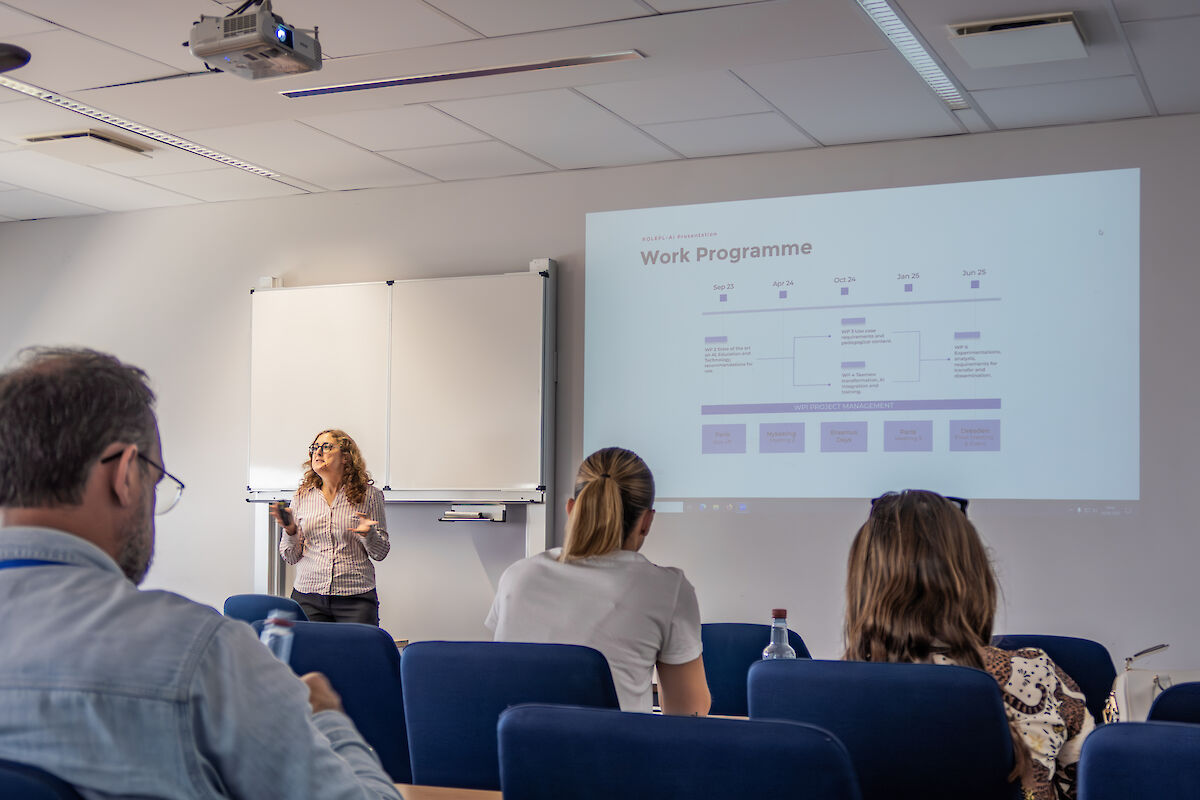 Der zweite Tag stand ganz im Zeichen der Präsentation der ROLEPL-AI-Projektergebnisse. Die Vorstellung des eigens entwickelten KI-gestützten Trainingsplattform in Teemew, die rollenspielbasierte Lernszenarien ermöglicht. Die Teilnehmenden konnten die KI-Applikationen anschließend vor Ort selbst testen und Feedback geben.